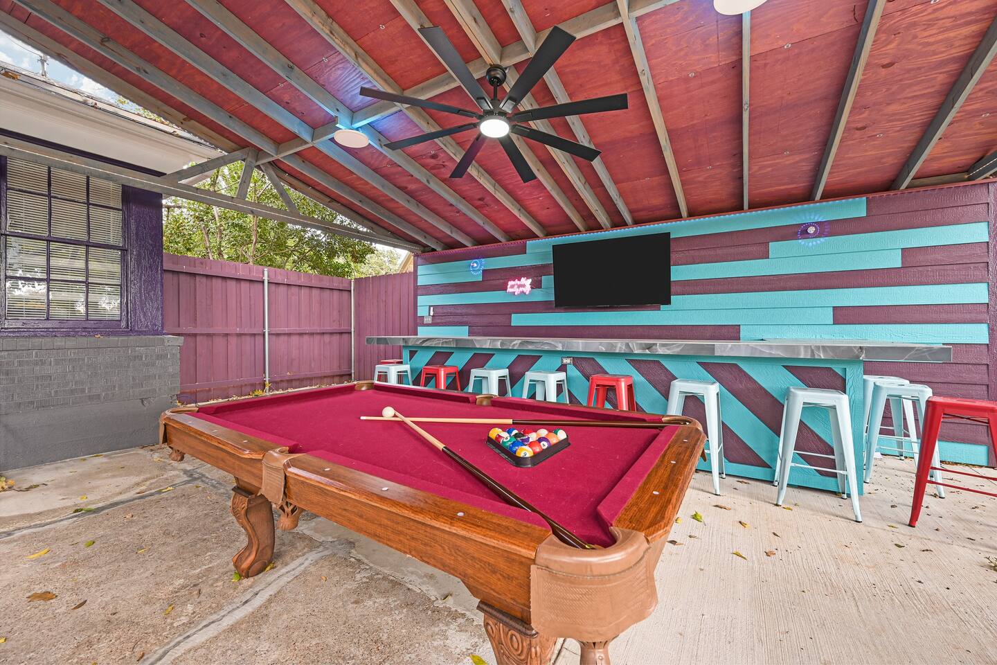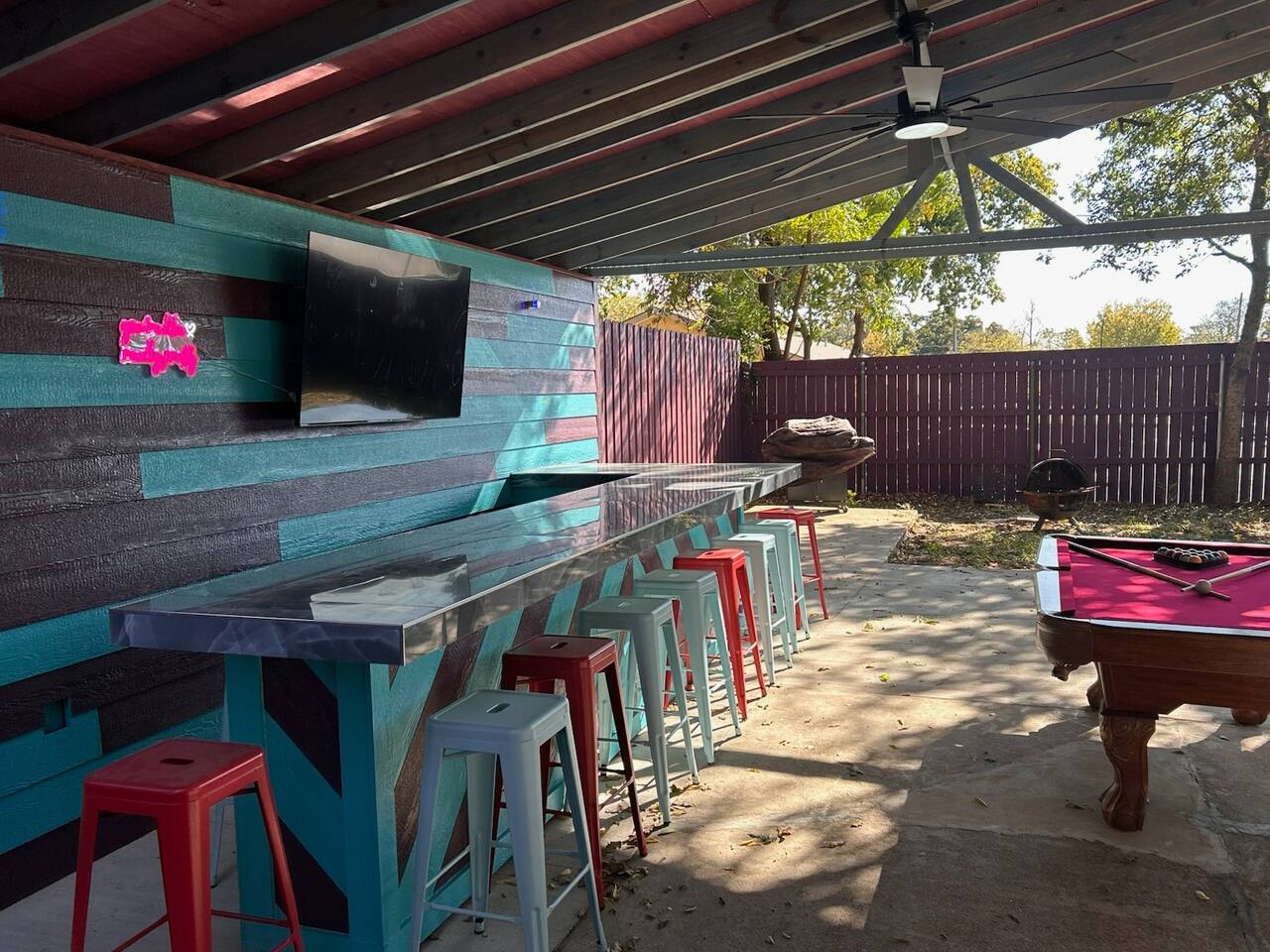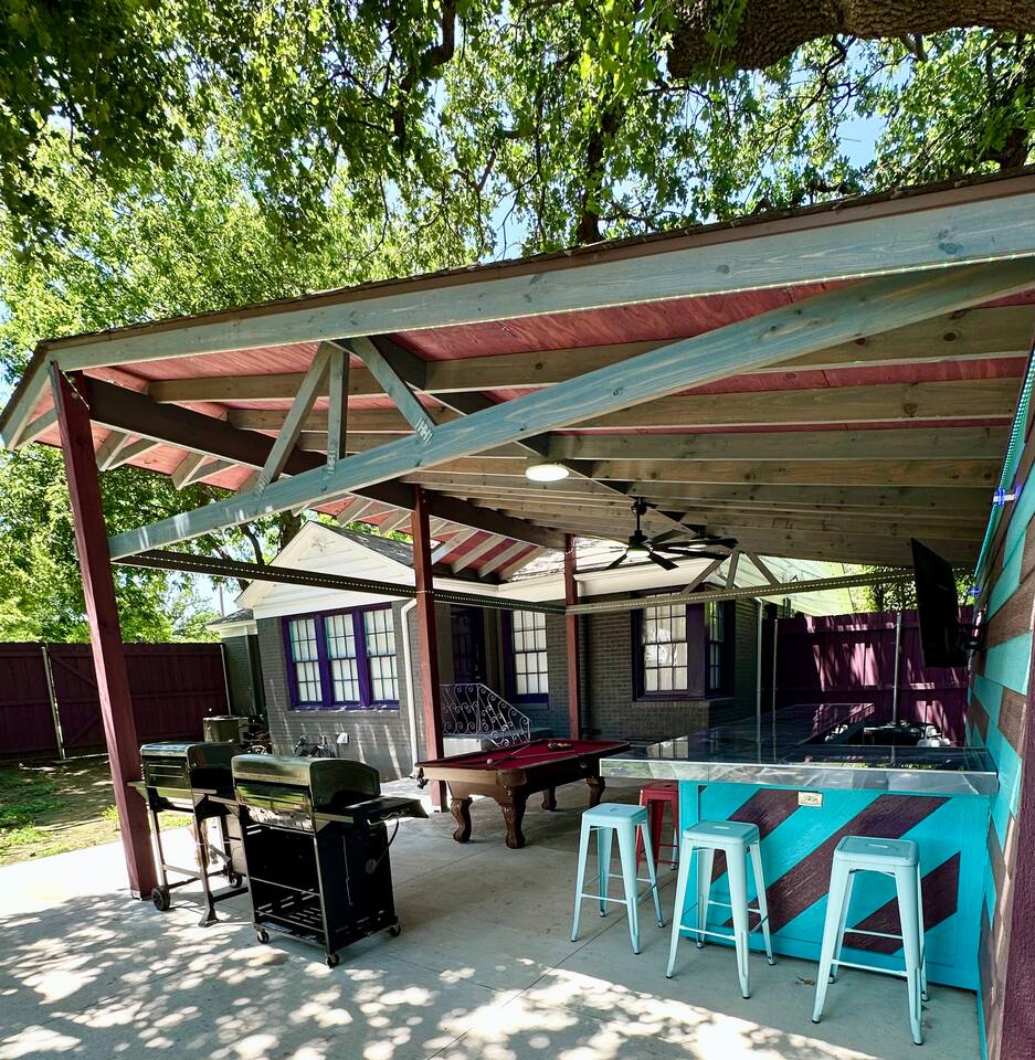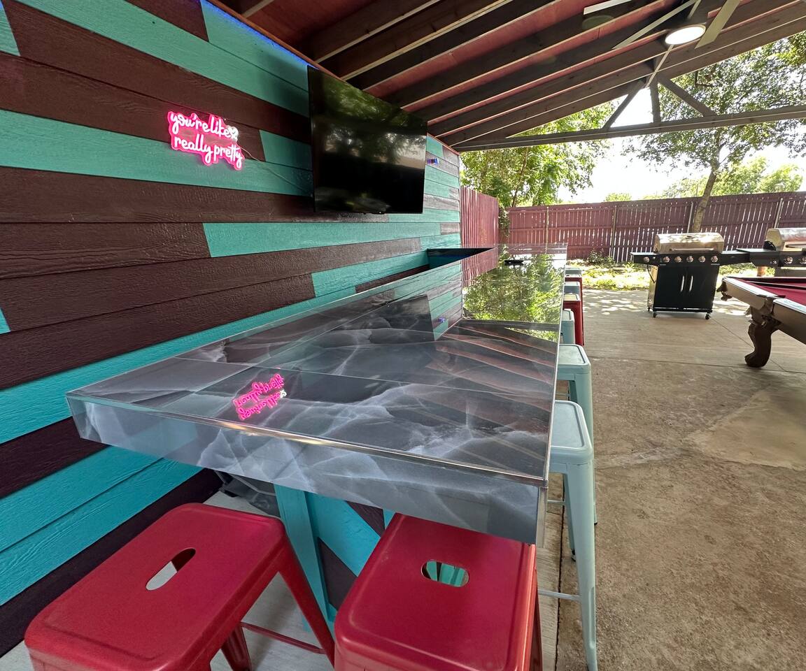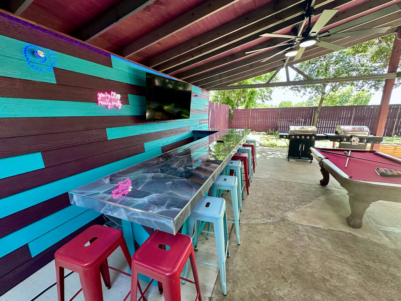 Our unique home has you feeling like everyday is your birthday & it's time to celebrate. Amazing location close to everything awesome in Arlington. 5 bedrooms, 12 beds, 4 full bathrooms an outdoor bar with led lights , big screen tvs dripping from the walls, hot tub, BBQ, firepit and tons of parking right in the middle of the most exciting city in DFW and 1.5 miles from the Stadiums and 6 flags. We are running monthly specials and will cater to workers needing a place for a extended stay.