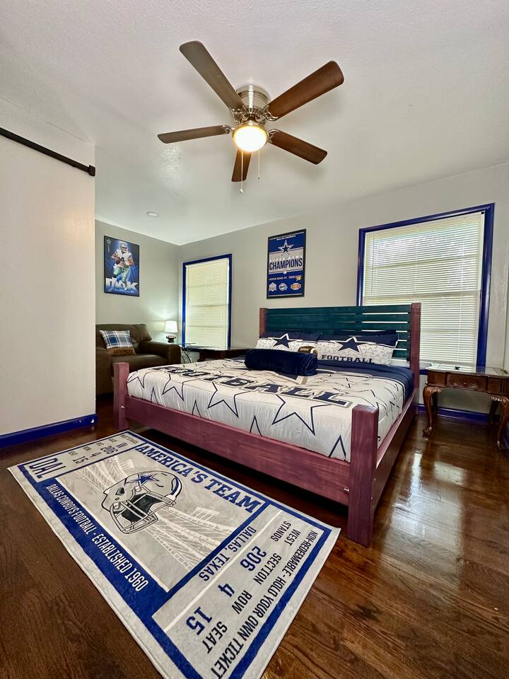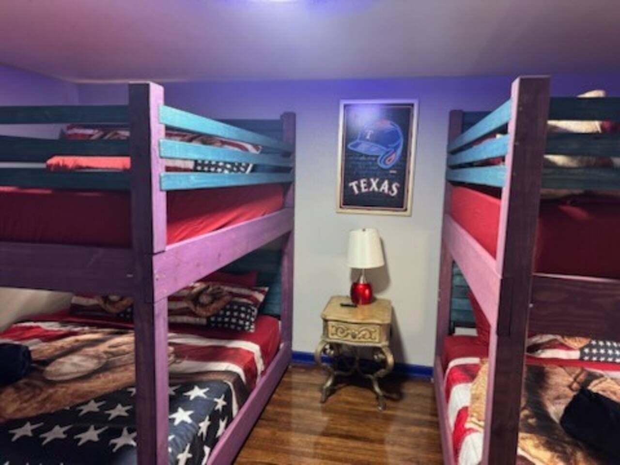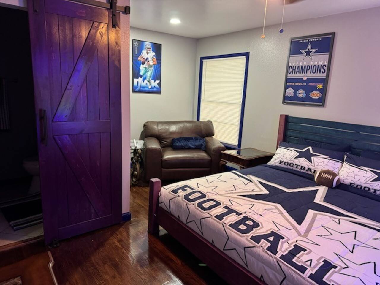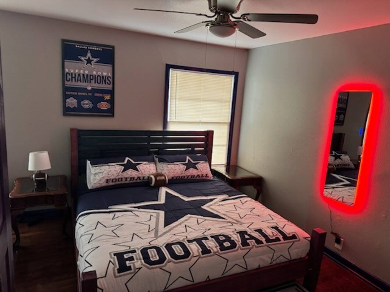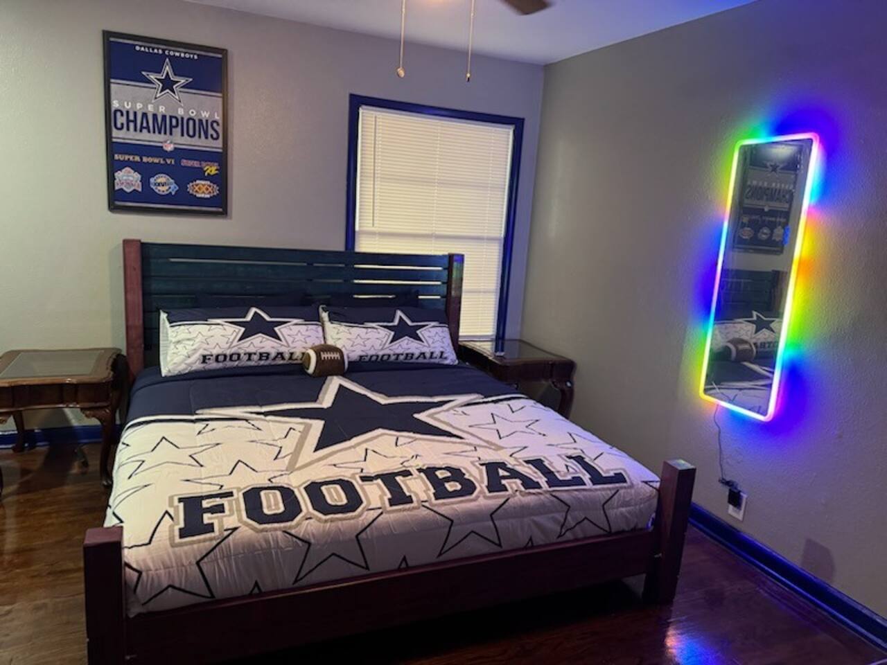 Welcome to our unique sports-themed getaway, designed for fans of football, hockey, and baseball! ๐Cowboys Room: Sleep in style with a luxurious king bed, football-themed bedding, and dรฉcor celebrating Super Bowl victories. A glowing LED mirror adds a modern touch and its own bathroom. ๐ Hockey Bunk Room: Featuring two sturdy twin bunk beds, this space is decked out with hockey-inspired bedding and wall art, illuminated by an adjustable LED ceiling light. โพ Texas Baseball Room: Cozy up in a patriotic, baseball-themed bunk room with rustic furniture, warm red accents, and vintage-style Texas dรฉcor. Relax in Style! Enjoy a spa-like experience in our sleek and stylish bathroom, designed for comfort and convenience. Featuring a luxurious rainfall shower panel with multiple jets, an illuminated LED mirror, and plush team-inspired dรฉcor, fresh towels, premium toiletries, and a clean, modern design ensure a refreshing and relaxing stay. Welcome to your private backyard - The covered patio features a custom sports-themed bar, complete with barstools, a mounted TV, and plenty of seating for guests. Whether you're watching the game or enjoying a cold drink, this space is designed for fun. Step into the expansive backyard, where you'll find a hot tub, a fire pit with bench seating, and a picnic table for outdoor dining. Have fun with life size connect four, String lights and a Texas-inspired ambiance adds a cozy touch, making it the ideal setting for day or night gatherings. This beautifully decorated home offers a cozy living space with plush leather seating, a modern fully equipped kitchen, and a chic dining area. The vibrant blue accents and sports-inspired decor create a unique, inviting atmosphere. Book now for a memorable stay!
