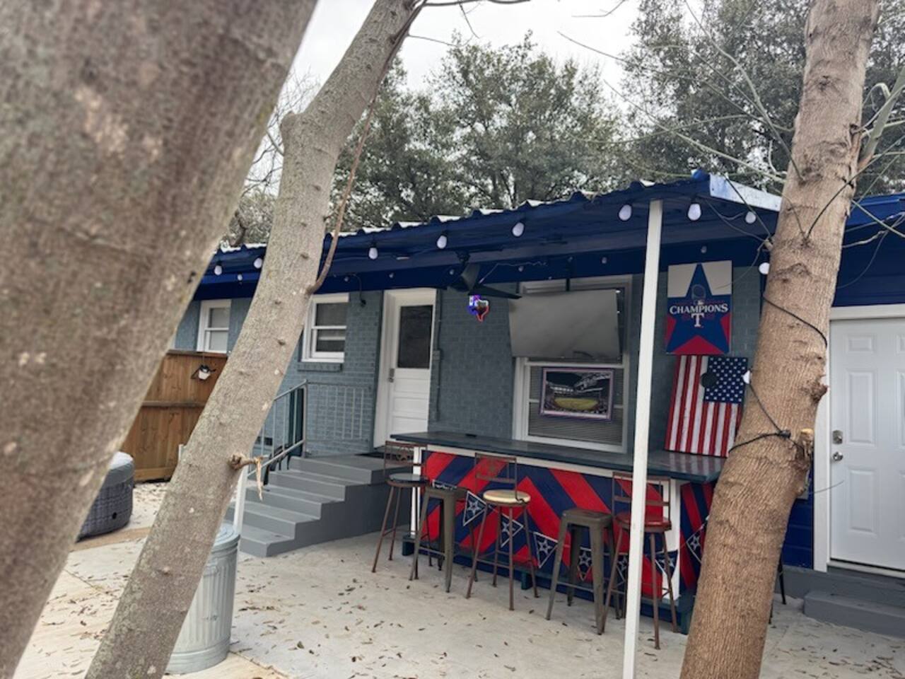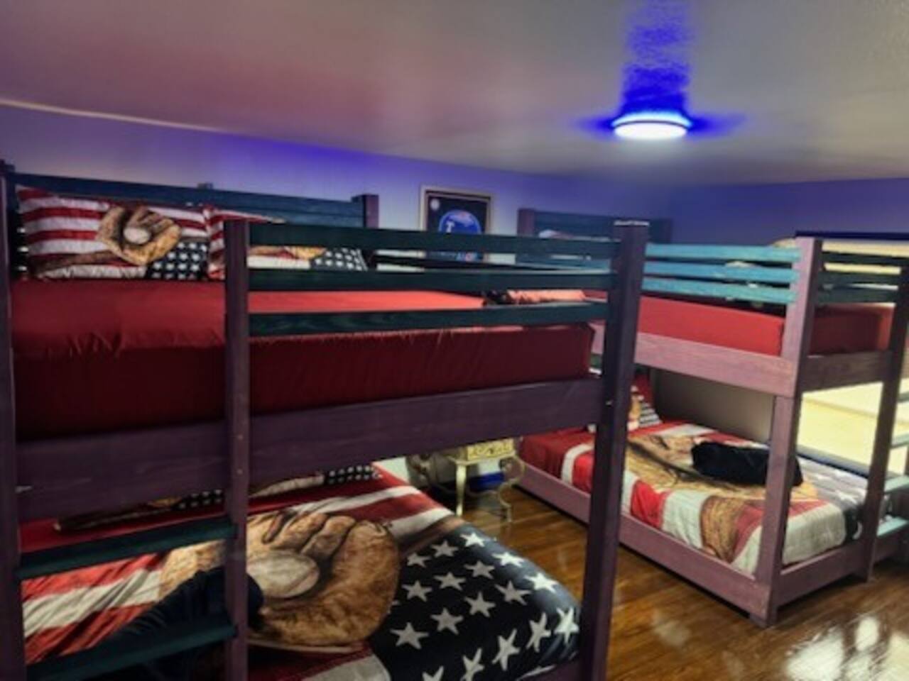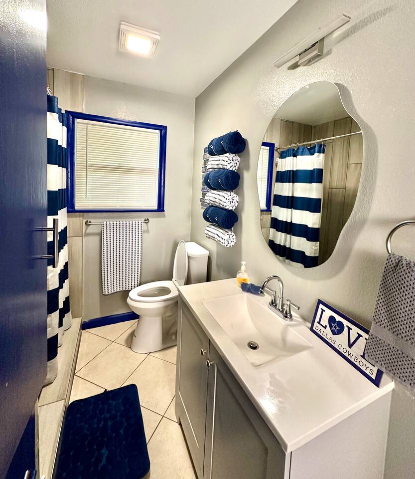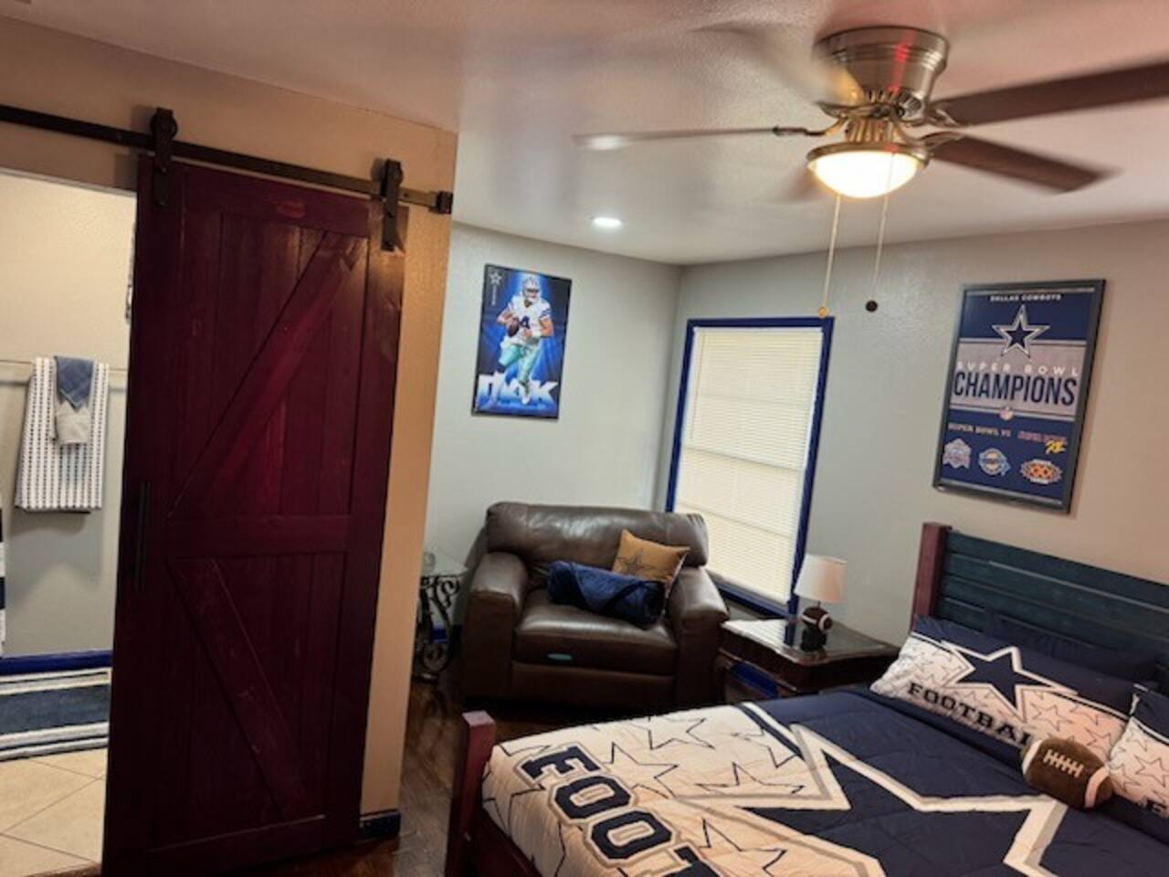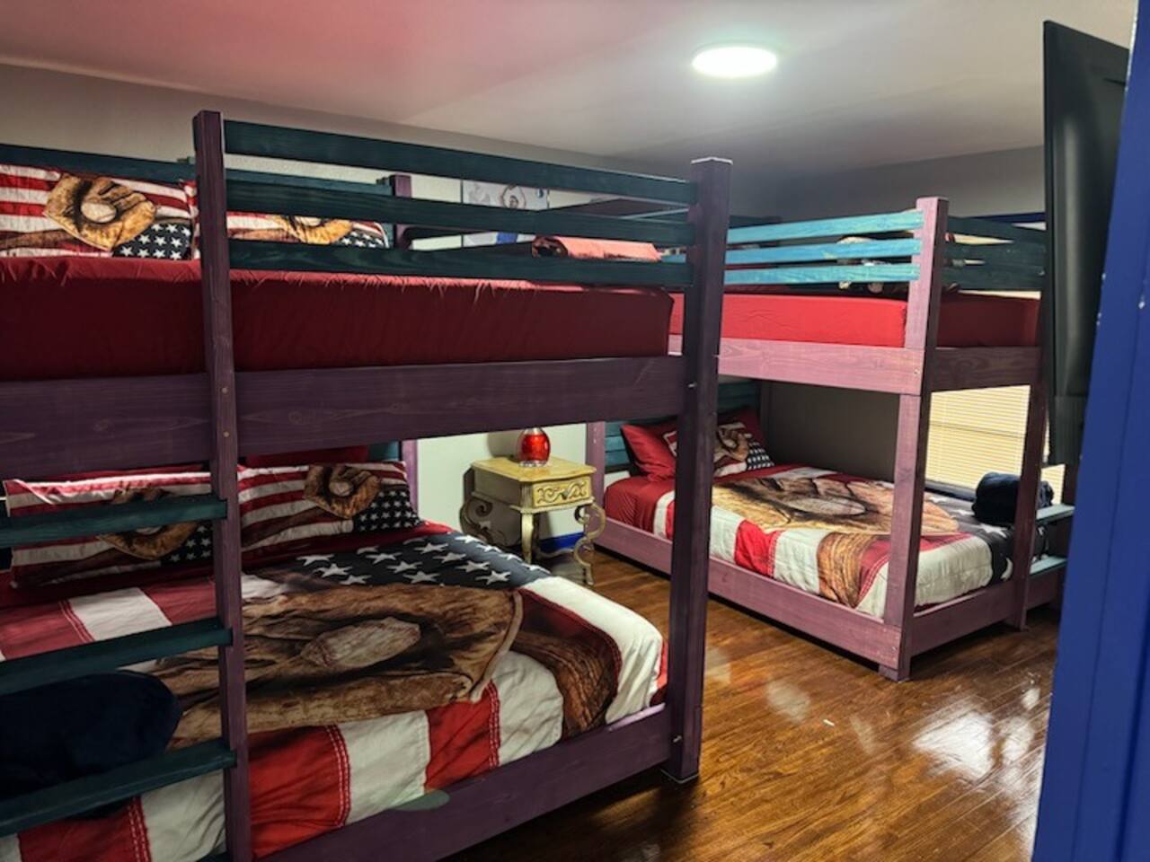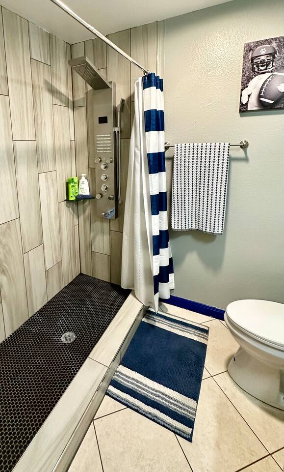 Welcome to our unique sports-themed getaway, designed for fans of football, hockey, and baseball! ๐Cowboys Room: Sleep in style with a luxurious king bed, football-themed bedding, and dรฉcor celebrating Super Bowl victories. A glowing LED mirror adds a modern touch and its own bathroom. ๐ Hockey Bunk Room: Featuring two sturdy twin bunk beds, this space is decked out with hockey-inspired bedding and wall art, illuminated by an adjustable LED ceiling light. โพ Texas Baseball Room: Cozy up in a patriotic, baseball-themed bunk room with rustic furniture, warm red accents, and vintage-style Texas dรฉcor. Relax in Style! Enjoy a spa-like experience in our sleek and stylish bathroom, designed for comfort and convenience. Featuring a luxurious rainfall shower panel with multiple jets, an illuminated LED mirror, and plush team-inspired dรฉcor, fresh towels, premium toiletries, and a clean, modern design ensure a refreshing and relaxing stay. Welcome to your private backyard - The covered patio features a custom sports-themed bar, complete with barstools, a mounted TV, and plenty of seating for guests. Whether you're watching the game or enjoying a cold drink, this space is designed for fun. Step into the expansive backyard, where you'll find a hot tub, a fire pit with bench seating, and a picnic table for outdoor dining. Have fun with life size connect four, String lights and a Texas-inspired ambiance adds a cozy touch, making it the ideal setting for day or night gatherings. This beautifully decorated home offers a cozy living space with plush leather seating, a modern fully equipped kitchen, and a chic dining area. The vibrant blue accents and sports-inspired decor create a unique, inviting atmosphere. Book now for a memorable stay!