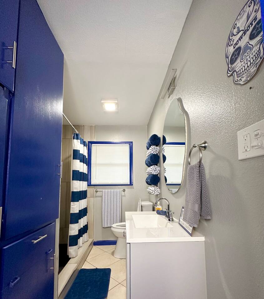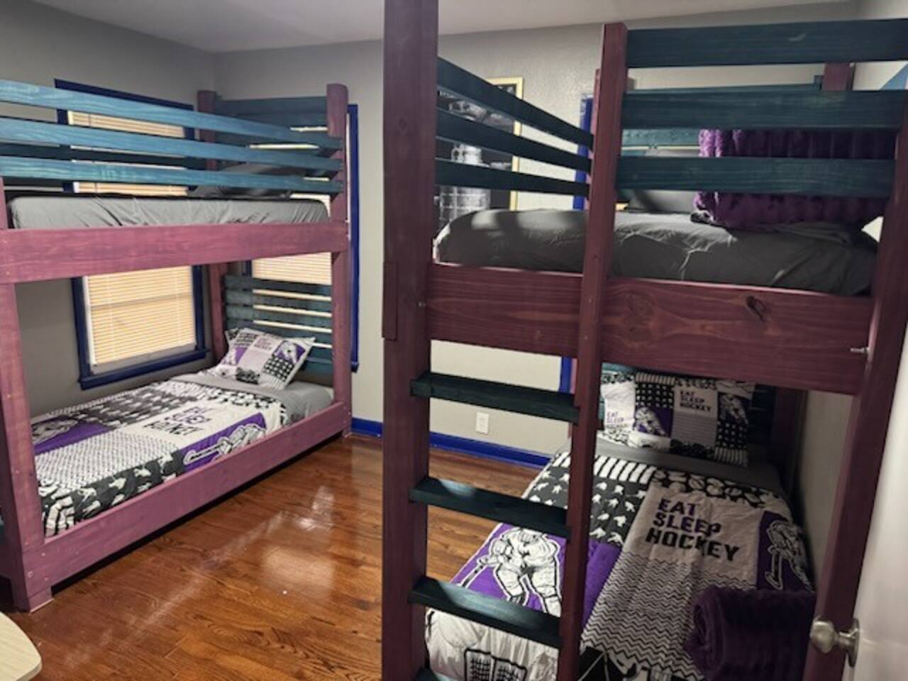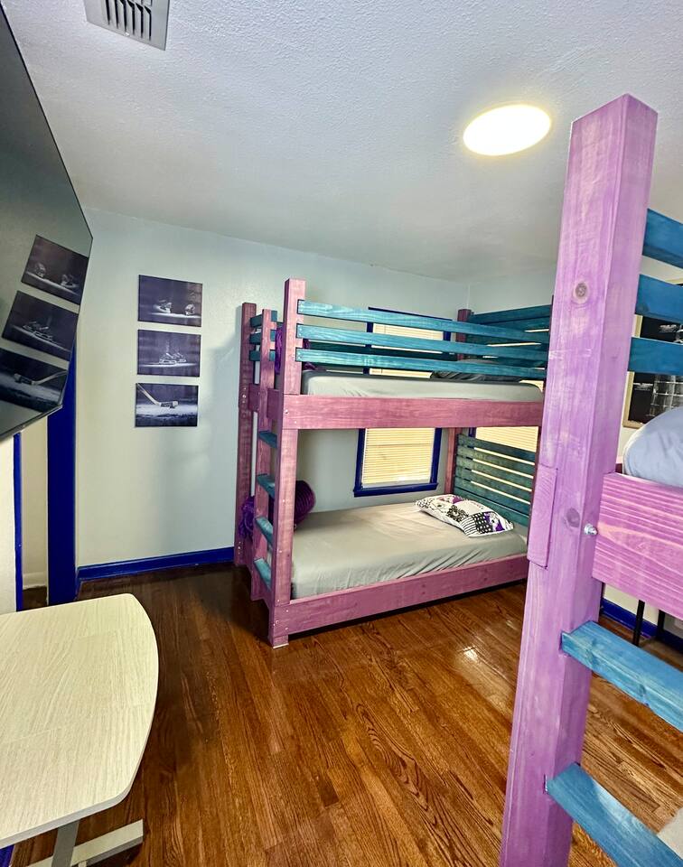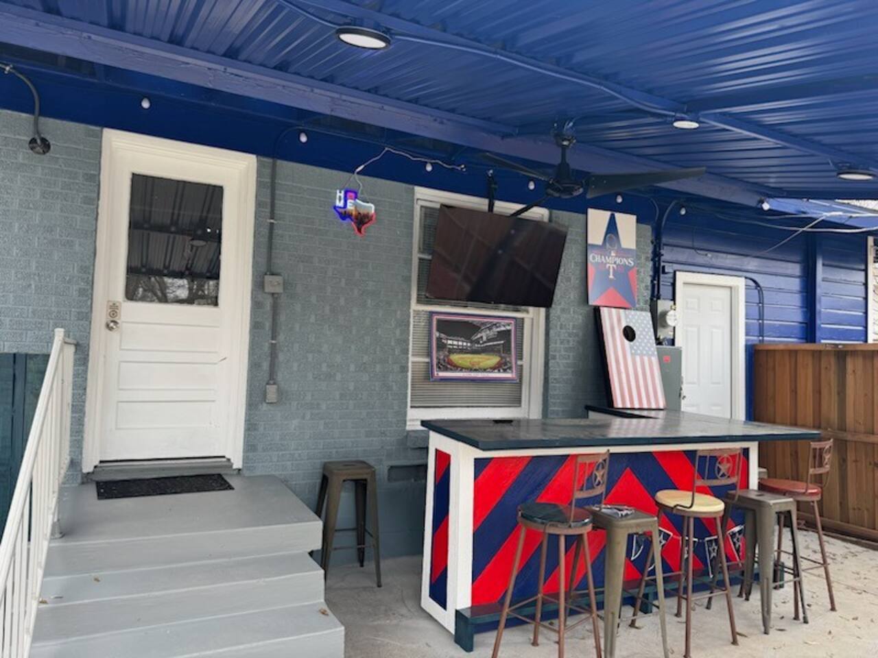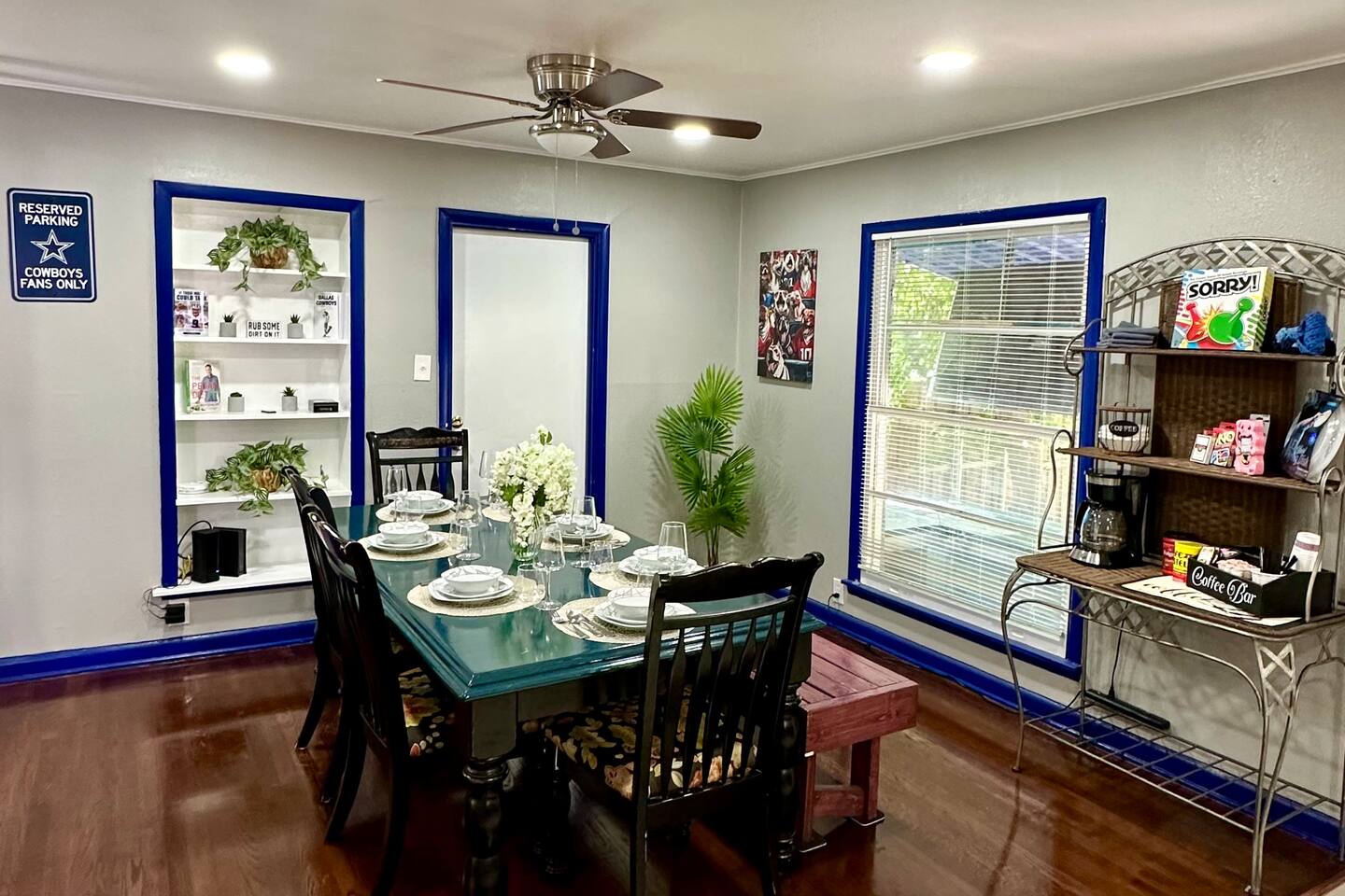 Welcome to our unique sports-themed getaway, designed for fans of football, hockey, and baseball! ๐Cowboys Room: Sleep in style with a luxurious king bed, football-themed bedding, and dรฉcor celebrating Super Bowl victories. A glowing LED mirror adds a modern touch and its own bathroom. ๐ Hockey Bunk Room: Featuring two sturdy twin bunk beds, this space is decked out with hockey-inspired bedding and wall art, illuminated by an adjustable LED ceiling light. โพ Texas Baseball Room: Cozy up in a patriotic, baseball-themed bunk room with rustic furniture, warm red accents, and vintage-style Texas dรฉcor. Relax in Style! Enjoy a spa-like experience in our sleek and stylish bathroom, designed for comfort and convenience. Featuring a luxurious rainfall shower panel with multiple jets, an illuminated LED mirror, and plush team-inspired dรฉcor, fresh towels, premium toiletries, and a clean, modern design ensure a refreshing and relaxing stay. Welcome to your private backyard - The covered patio features a custom sports-themed bar, complete with barstools, a mounted TV, and plenty of seating for guests. Whether you're watching the game or enjoying a cold drink, this space is designed for fun. Step into the expansive backyard, where you'll find a hot tub, a fire pit with bench seating, and a picnic table for outdoor dining. Have fun with life size connect four, String lights and a Texas-inspired ambiance adds a cozy touch, making it the ideal setting for day or night gatherings. This beautifully decorated home offers a cozy living space with plush leather seating, a modern fully equipped kitchen, and a chic dining area. The vibrant blue accents and sports-inspired decor create a unique, inviting atmosphere. Book now for a memorable stay!
