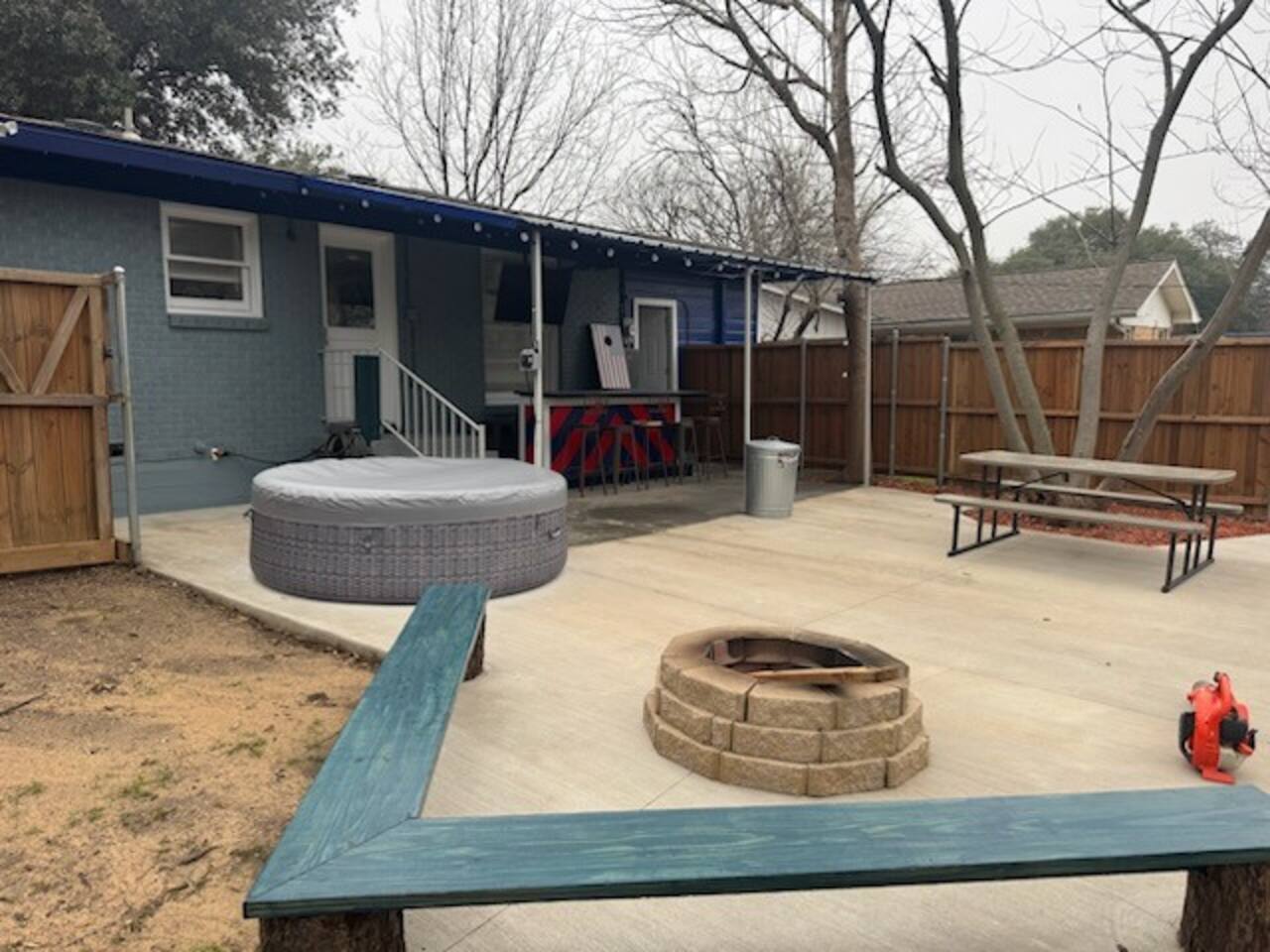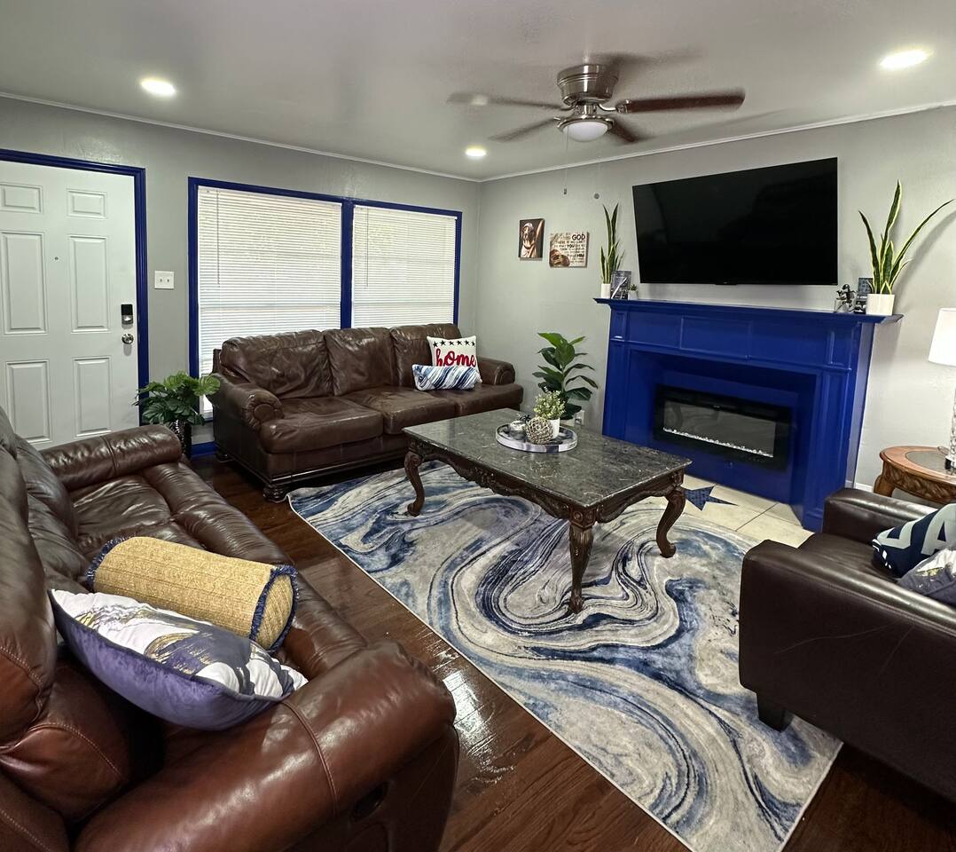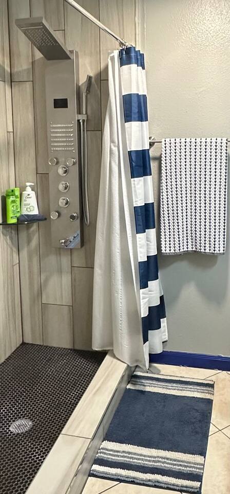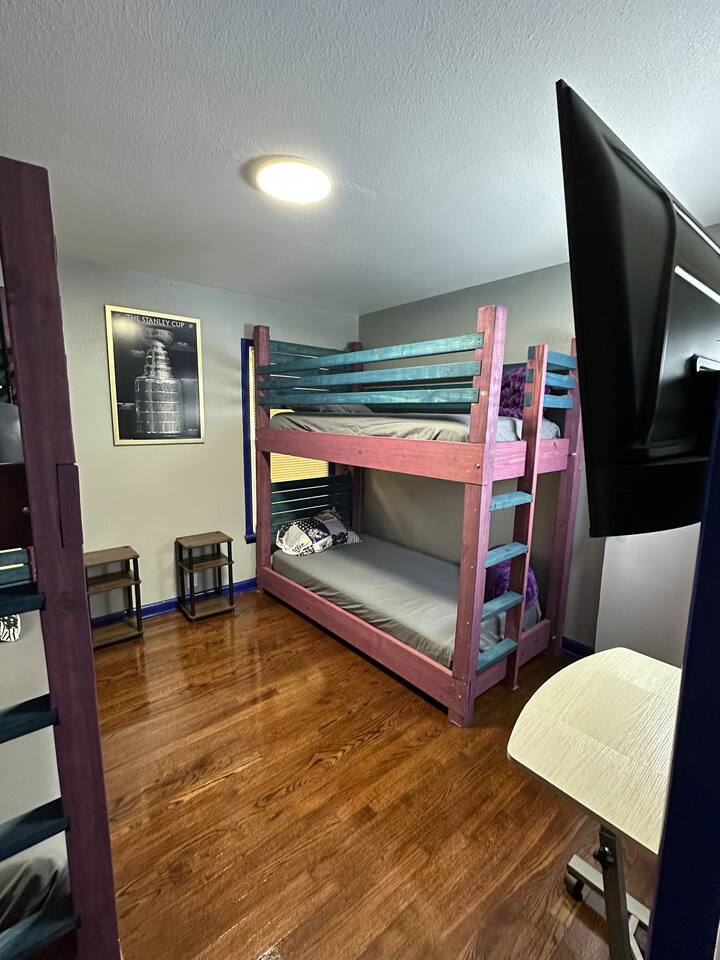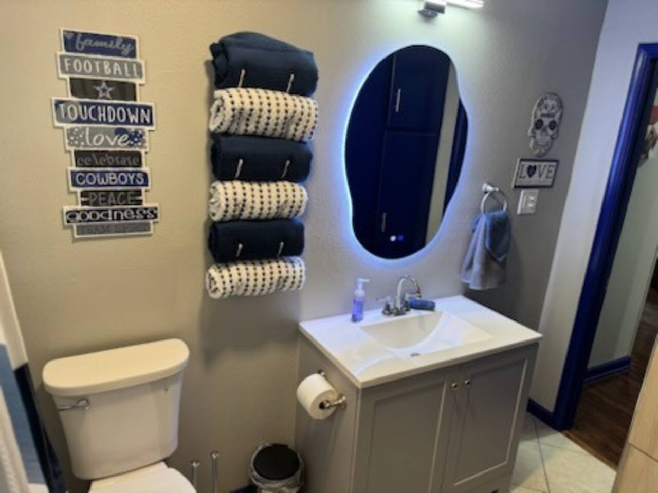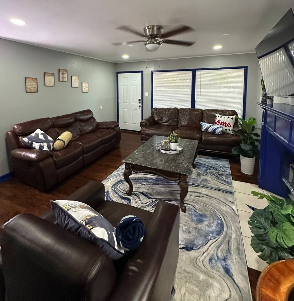 Welcome to our unique sports-themed getaway, designed for fans of football, hockey, and baseball! ๐Cowboys Room: Sleep in style with a luxurious king bed, football-themed bedding, and dรฉcor celebrating Super Bowl victories. A glowing LED mirror adds a modern touch and its own bathroom. ๐ Hockey Bunk Room: Featuring two sturdy twin bunk beds, this space is decked out with hockey-inspired bedding and wall art, illuminated by an adjustable LED ceiling light. โพ Texas Baseball Room: Cozy up in a patriotic, baseball-themed bunk room with rustic furniture, warm red accents, and vintage-style Texas dรฉcor. Relax in Style! Enjoy a spa-like experience in our sleek and stylish bathroom, designed for comfort and convenience. Featuring a luxurious rainfall shower panel with multiple jets, an illuminated LED mirror, and plush team-inspired dรฉcor, fresh towels, premium toiletries, and a clean, modern design ensure a refreshing and relaxing stay. Welcome to your private backyard - The covered patio features a custom sports-themed bar, complete with barstools, a mounted TV, and plenty of seating for guests. Whether you're watching the game or enjoying a cold drink, this space is designed for fun. Step into the expansive backyard, where you'll find a hot tub, a fire pit with bench seating, and a picnic table for outdoor dining. Have fun with life size connect four, String lights and a Texas-inspired ambiance adds a cozy touch, making it the ideal setting for day or night gatherings. This beautifully decorated home offers a cozy living space with plush leather seating, a modern fully equipped kitchen, and a chic dining area. The vibrant blue accents and sports-inspired decor create a unique, inviting atmosphere. Book now for a memorable stay!
