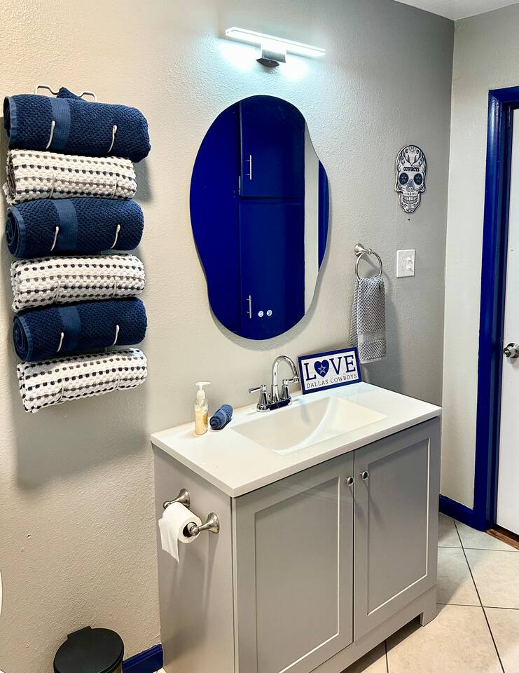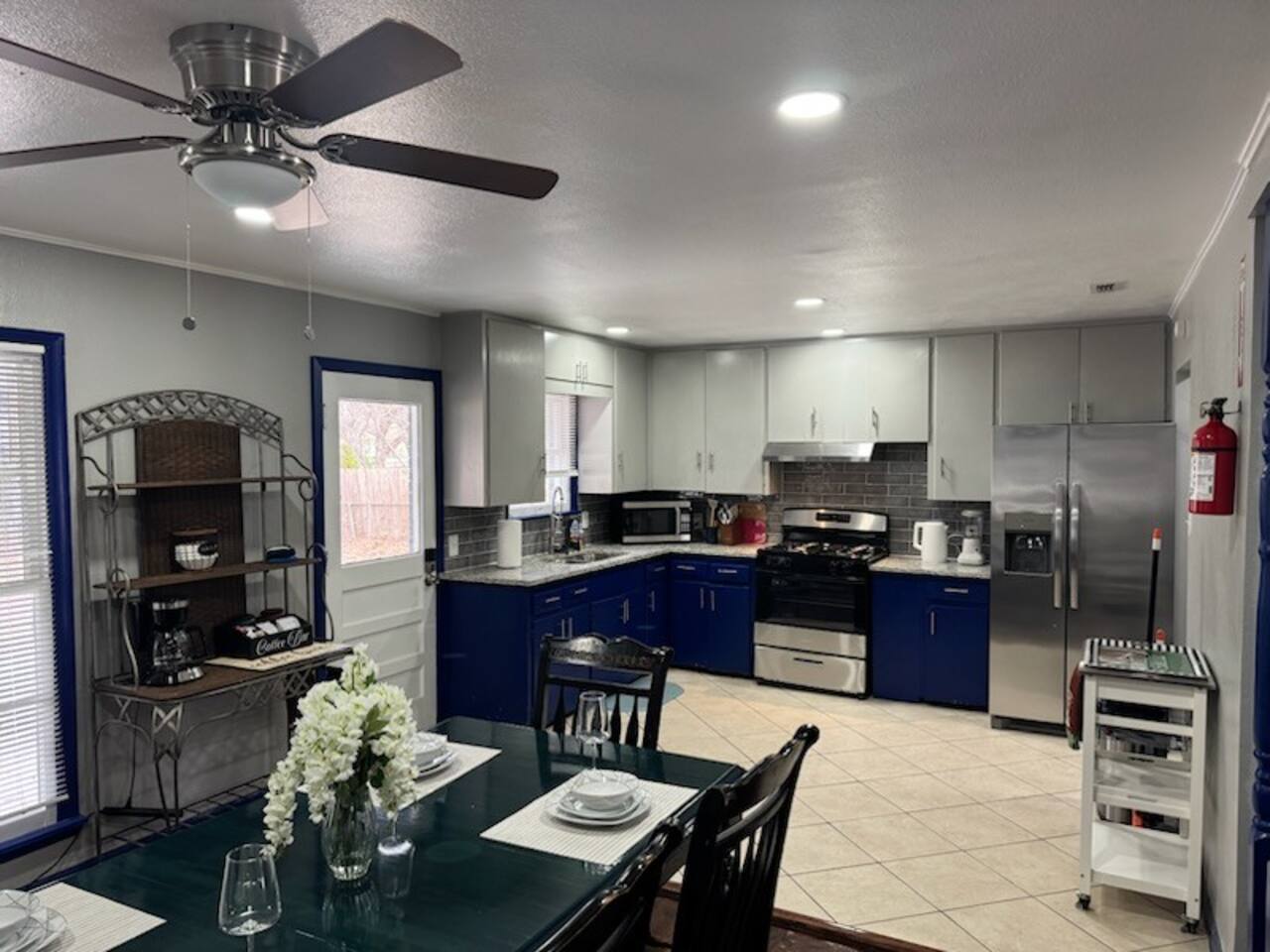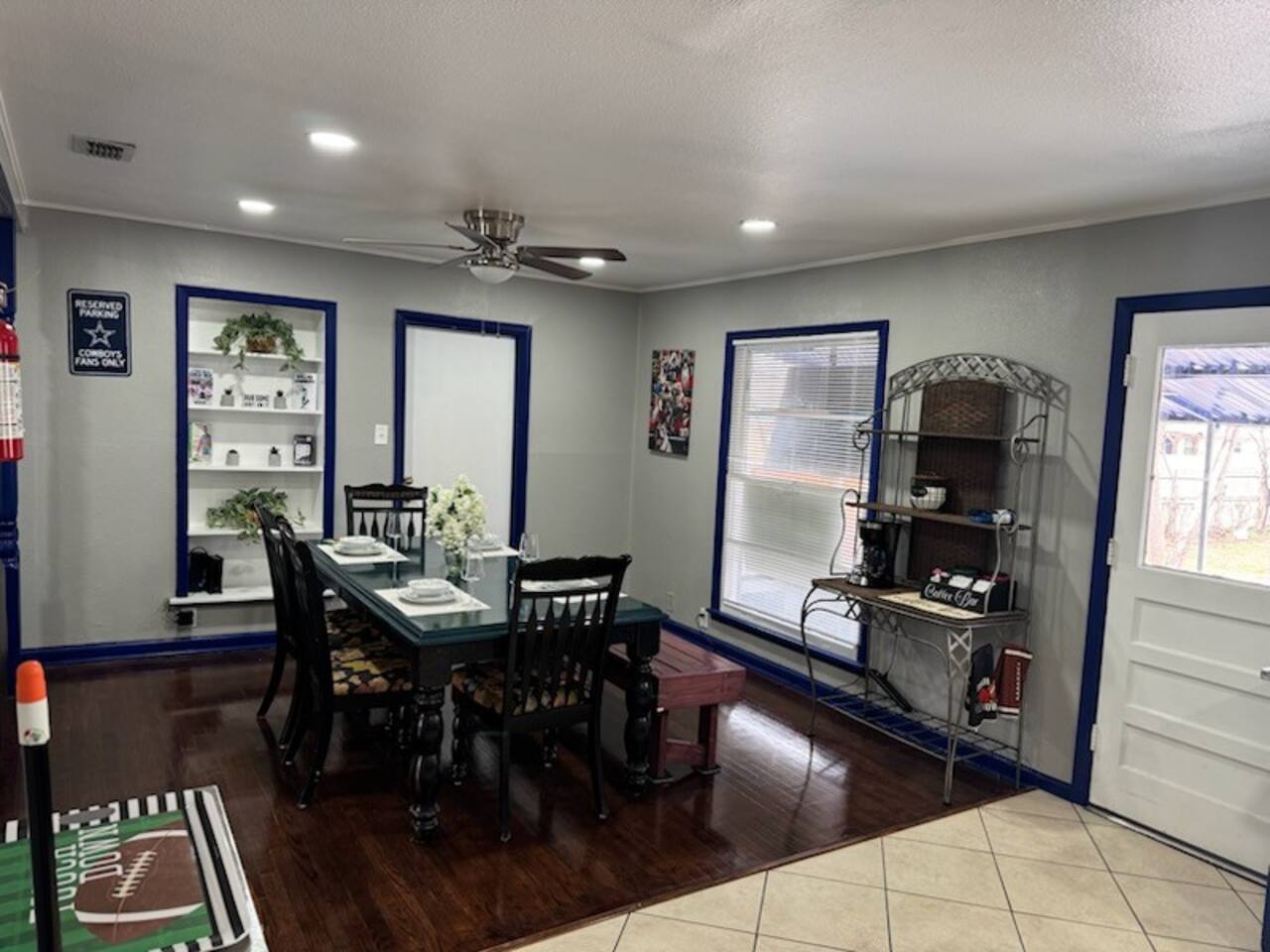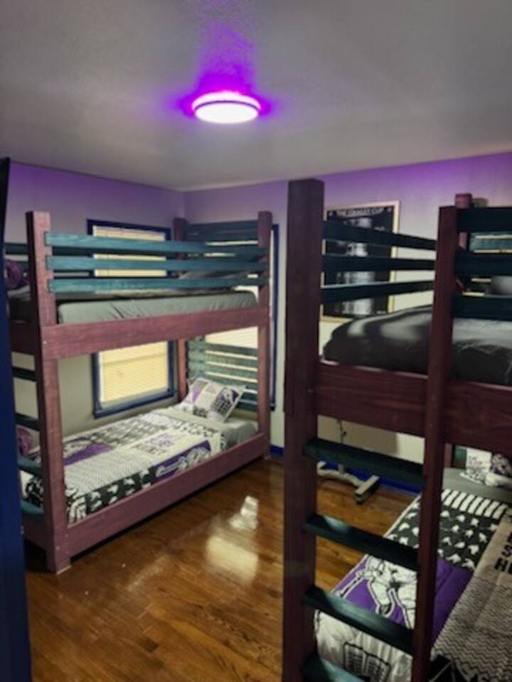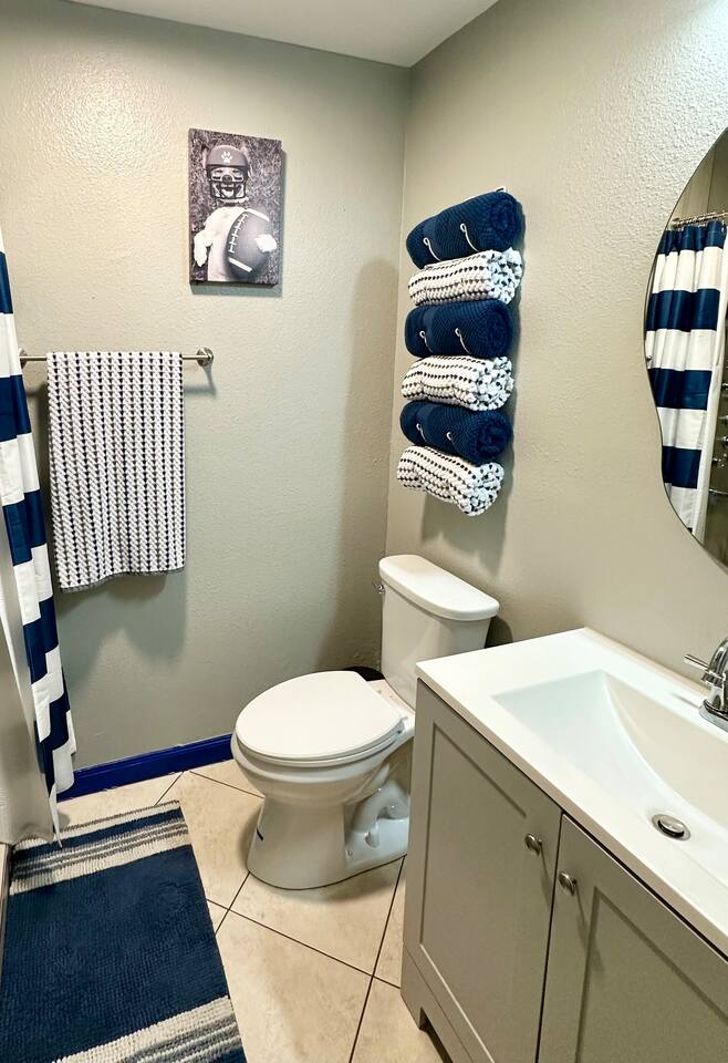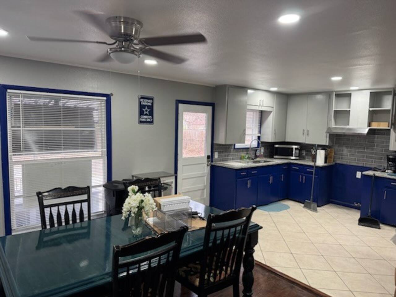 Welcome to our unique sports-themed getaway, designed for fans of football, hockey, and baseball! ๐Cowboys Room: Sleep in style with a luxurious king bed, football-themed bedding, and dรฉcor celebrating Super Bowl victories. A glowing LED mirror adds a modern touch and its own bathroom. ๐ Hockey Bunk Room: Featuring two sturdy twin bunk beds, this space is decked out with hockey-inspired bedding and wall art, illuminated by an adjustable LED ceiling light. โพ Texas Baseball Room: Cozy up in a patriotic, baseball-themed bunk room with rustic furniture, warm red accents, and vintage-style Texas dรฉcor. Relax in Style! Enjoy a spa-like experience in our sleek and stylish bathroom, designed for comfort and convenience. Featuring a luxurious rainfall shower panel with multiple jets, an illuminated LED mirror, and plush team-inspired dรฉcor, fresh towels, premium toiletries, and a clean, modern design ensure a refreshing and relaxing stay. Welcome to your private backyard - The covered patio features a custom sports-themed bar, complete with barstools, a mounted TV, and plenty of seating for guests. Whether you're watching the game or enjoying a cold drink, this space is designed for fun. Step into the expansive backyard, where you'll find a hot tub, a fire pit with bench seating, and a picnic table for outdoor dining. Have fun with life size connect four, String lights and a Texas-inspired ambiance adds a cozy touch, making it the ideal setting for day or night gatherings. This beautifully decorated home offers a cozy living space with plush leather seating, a modern fully equipped kitchen, and a chic dining area. The vibrant blue accents and sports-inspired decor create a unique, inviting atmosphere. Book now for a memorable stay!