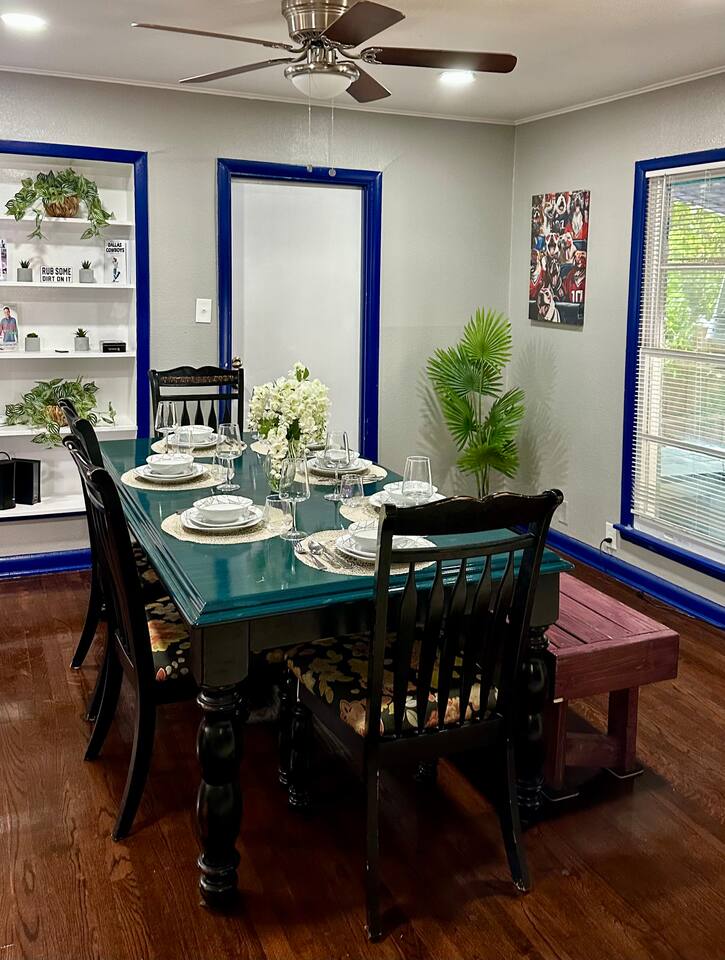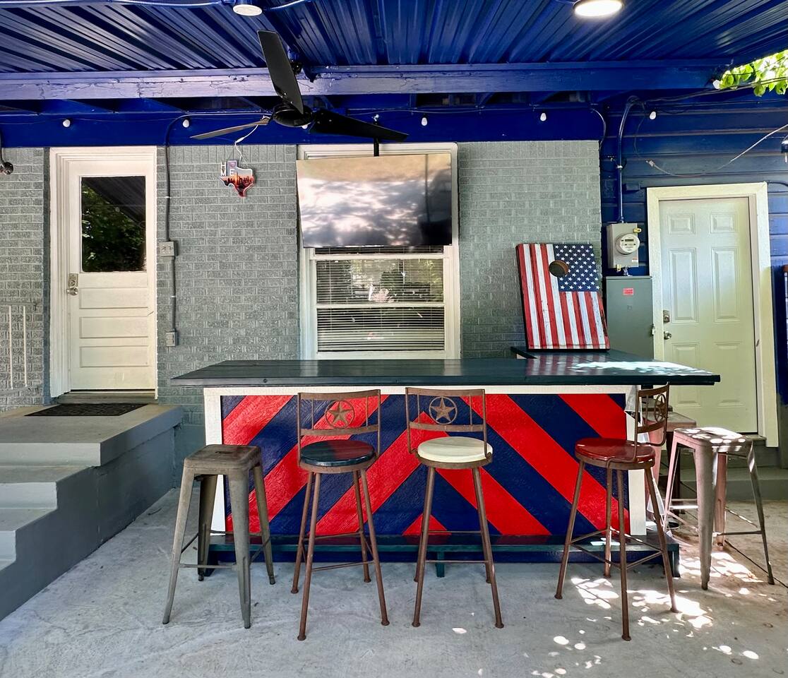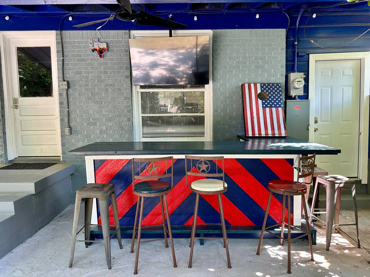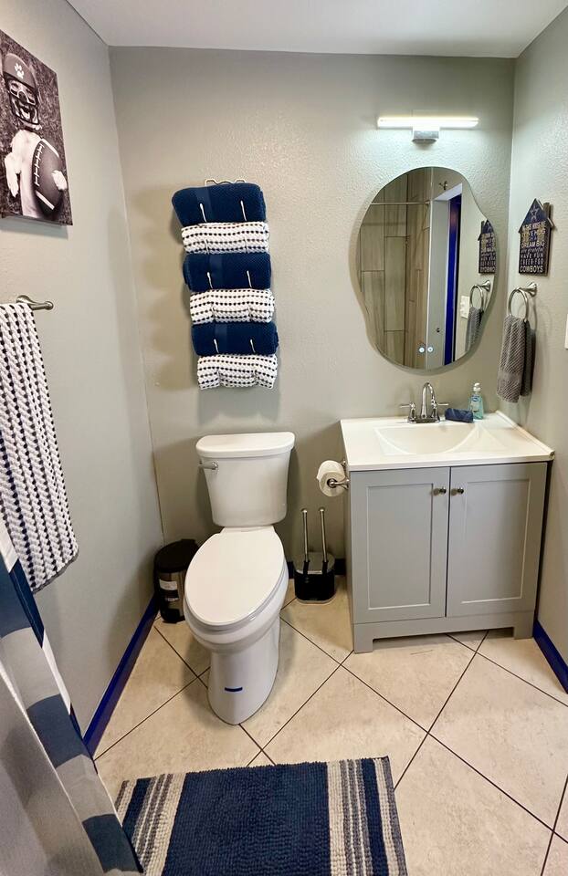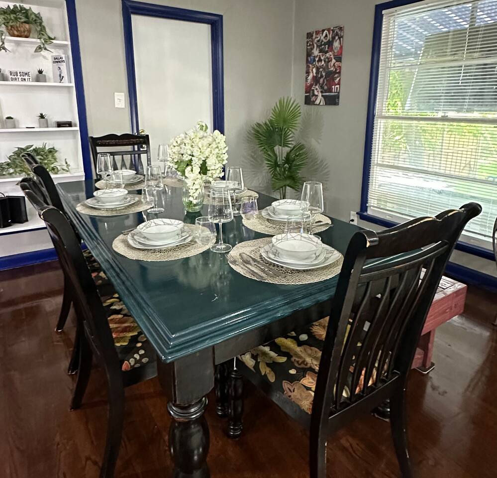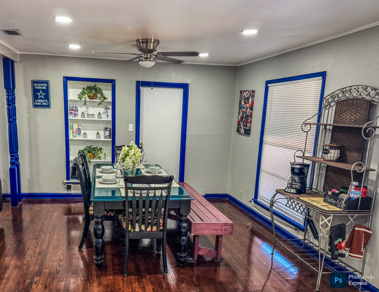 Welcome to our unique sports-themed getaway, designed for fans of football, hockey, and baseball! ๐Cowboys Room: Sleep in style with a luxurious king bed, football-themed bedding, and dรฉcor celebrating Super Bowl victories. A glowing LED mirror adds a modern touch and its own bathroom. ๐ Hockey Bunk Room: Featuring two sturdy twin bunk beds, this space is decked out with hockey-inspired bedding and wall art, illuminated by an adjustable LED ceiling light. โพ Texas Baseball Room: Cozy up in a patriotic, baseball-themed bunk room with rustic furniture, warm red accents, and vintage-style Texas dรฉcor. Relax in Style! Enjoy a spa-like experience in our sleek and stylish bathroom, designed for comfort and convenience. Featuring a luxurious rainfall shower panel with multiple jets, an illuminated LED mirror, and plush team-inspired dรฉcor, fresh towels, premium toiletries, and a clean, modern design ensure a refreshing and relaxing stay. Welcome to your private backyard - The covered patio features a custom sports-themed bar, complete with barstools, a mounted TV, and plenty of seating for guests. Whether you're watching the game or enjoying a cold drink, this space is designed for fun. Step into the expansive backyard, where you'll find a hot tub, a fire pit with bench seating, and a picnic table for outdoor dining. Have fun with life size connect four, String lights and a Texas-inspired ambiance adds a cozy touch, making it the ideal setting for day or night gatherings. This beautifully decorated home offers a cozy living space with plush leather seating, a modern fully equipped kitchen, and a chic dining area. The vibrant blue accents and sports-inspired decor create a unique, inviting atmosphere. Book now for a memorable stay!